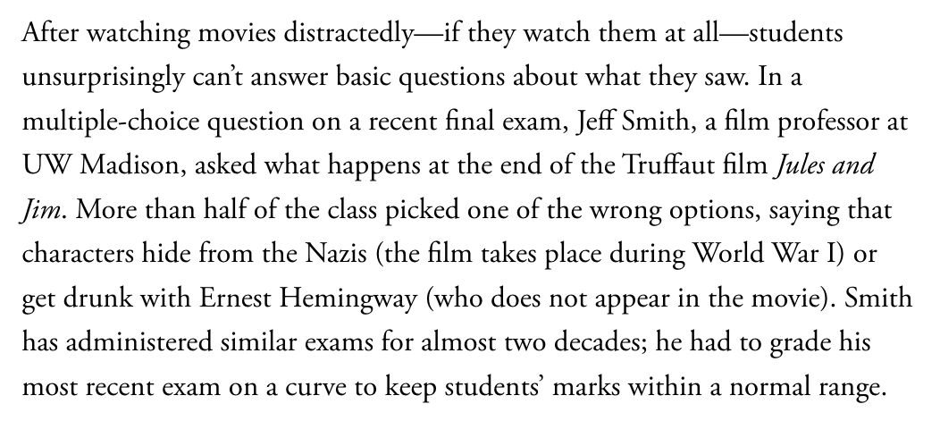 The attention crisis is so dire at schools right now that film professors can't even get their students to finish movies, and the kids don't even look up the plots of the movies they skip, so students fail basic in-class quizzes like "what happened at the end of the movie?"