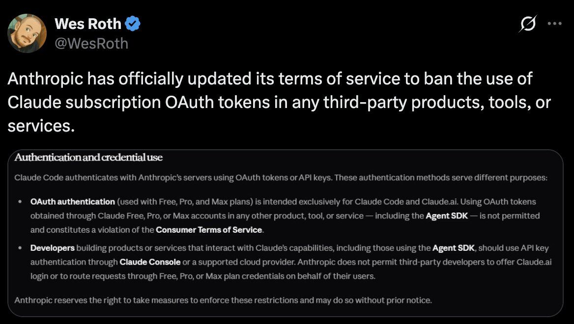 Anthropic's terms now explicitly ban OAuth tokens from consumer plans in any third-party tool, including their own Agent SDK. When even your own SDK isn't exempt, the message is clear: use our closed-source tool, or pay API rates. Screenshot: @WesRoth