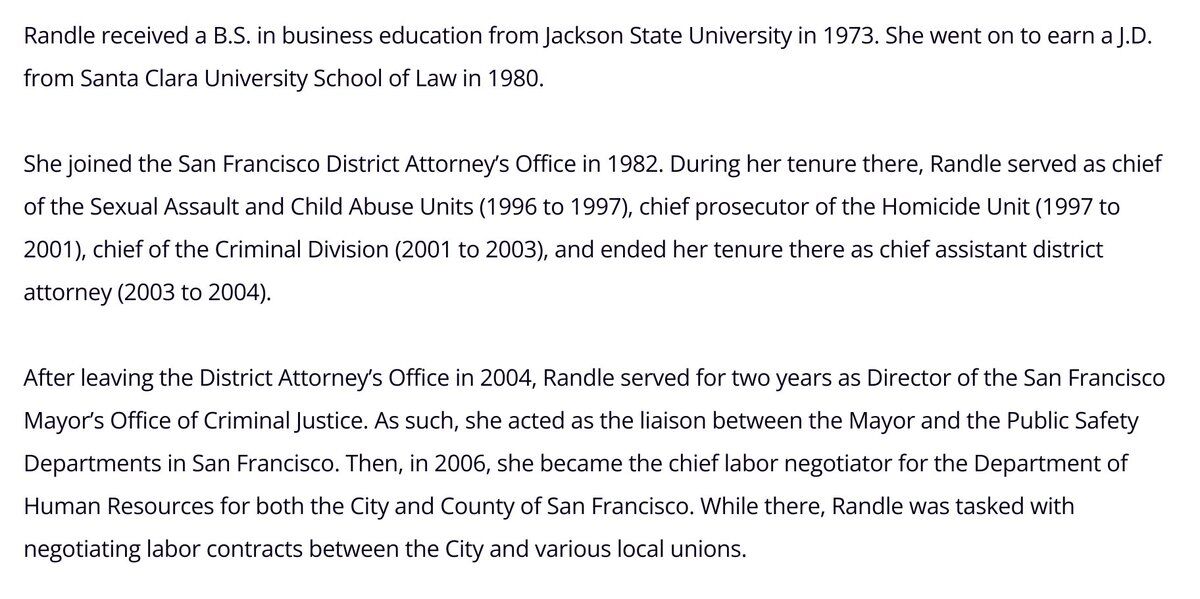 According to Trellis.Law, Randle spent 22 years in the San Francisco District Attorney’s Office. She served as chief of the Sexual Assault and Child Abuse Units (1996-1997), chief prosecutor of the Homicide Unit (1997-2001), chief of the Criminal Division (2001-2003), and finished as chief assistant district attorney. She later served as Director of the Mayor’s Office of Criminal Justice.