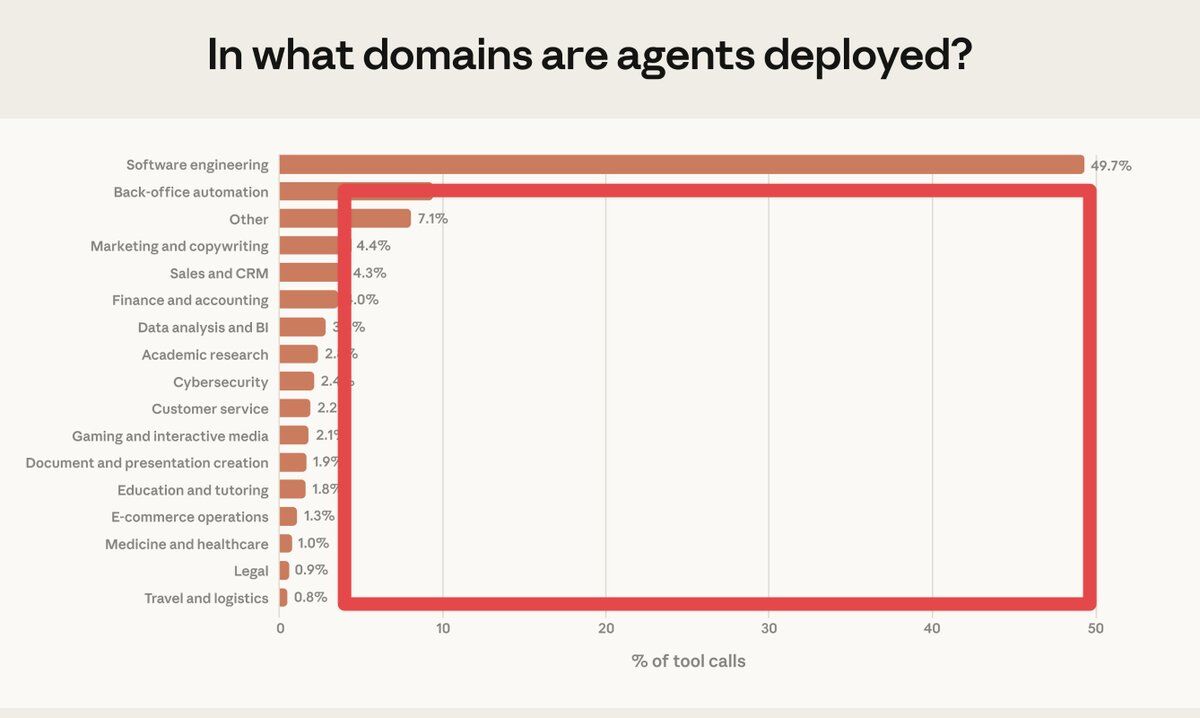 Anthropic just published the most comprehensive study of how AI agents actually work in the wild. The headline: software engineering accounts for 49.7% of agentic tool calls on their API. The buried lede: everything else is greenfield.