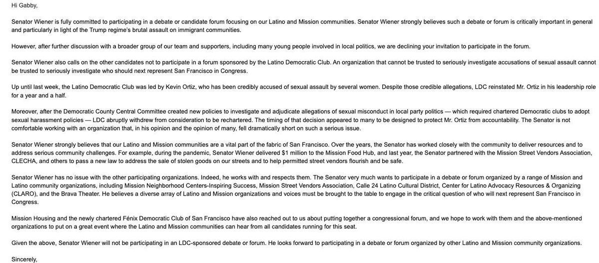 Senator Wiener declined the forum invitation and is calling on other candidates to do the same. His campaign’s logic is airtight: “An organization that cannot be trusted to seriously investigate accusations of sexual assault cannot be trusted to seriously investigate who should next represent San Francisco in Congress.”