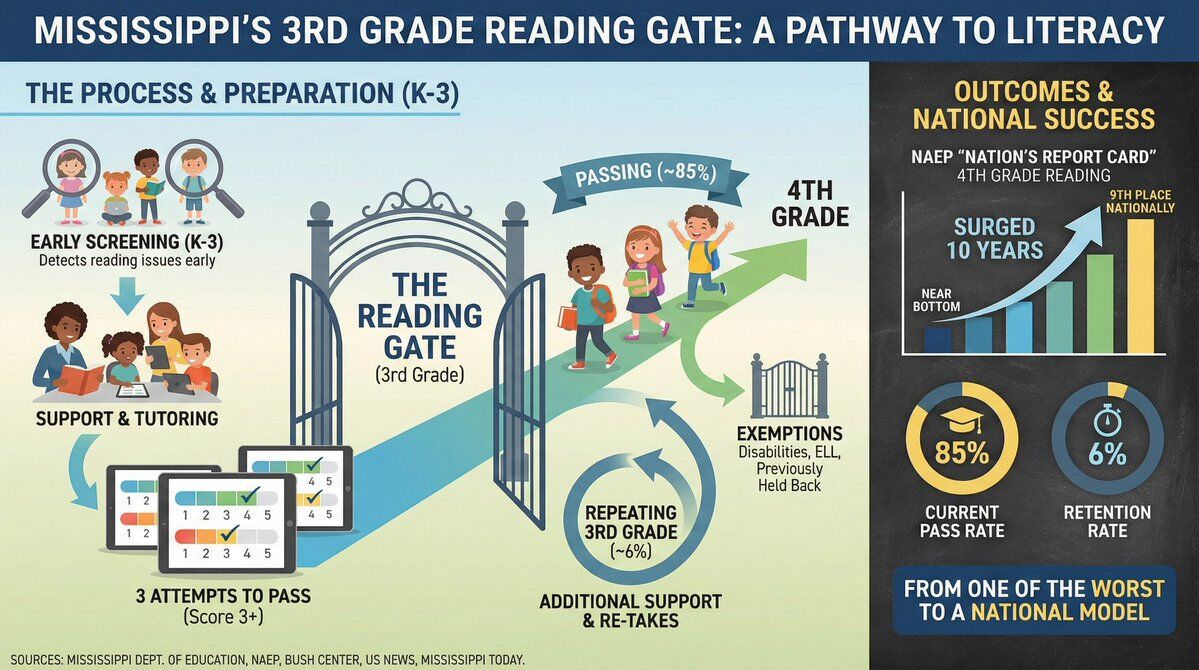 Mississippi went from 49th in reading to the top after implementing the 2013 Literacy-Based Promotion Act. The core mechanism: a third grade reading gate. If you canât read at grade level by third grade, you repeat until you can.
