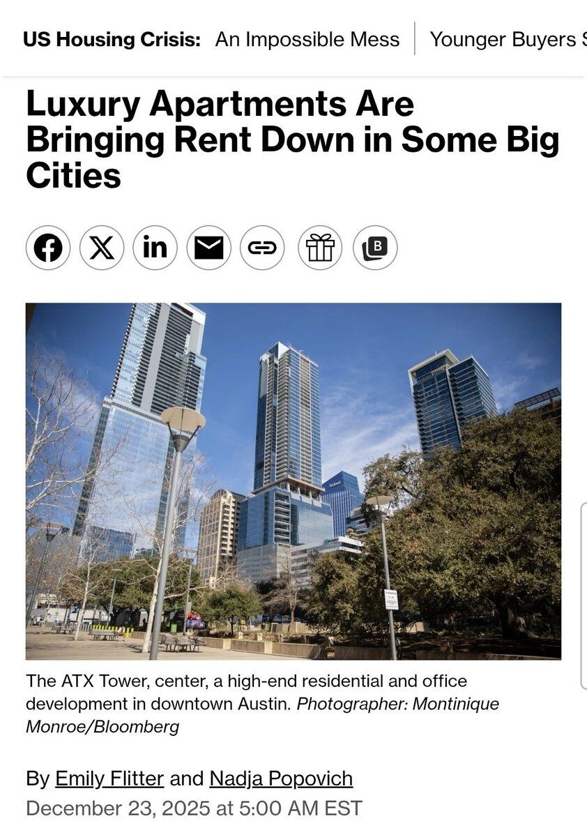The Bloomberg research couldn’t be clearer. Austin built apartments at 6.8% annual growth and saw rents crater 15.2% from their peak. Nashville, Charlotte, and Denver all show the same pattern. Meanwhile, cities that restricted building watched rents stay stubbornly high.