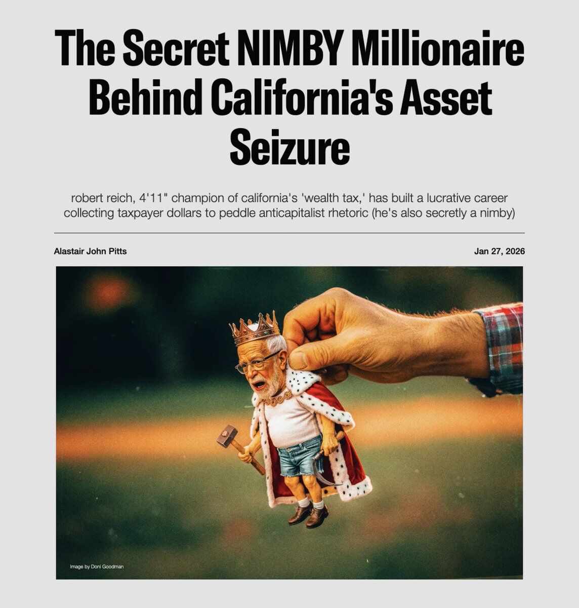 NEW IN PIRATE WIRES: Meet the millionaire NIMBY behind California’s proposed “wealth tax.” While billionaires and political reps have dominated headlines about the proposed asset seizure, the measure’s leading proponents have escaped deeper scrutiny. Today, we’re changing that. Robert Reich, 79-year-old Emeritus Professor of Public Policy at Berkeley, is essentially a hired gun on behalf of the unions and academics who crafted the asset seizure proposition. He spent the Carter years at the FTC, advised three U.S. presidents, and served as Clinton’s Labor Secretary before settling into academia... and along the way, he discovered a more lucrative calling: charging six-figure speaking fees to denounce capitalism for wealthy audiences. He fashions himself as a champion content creator of the working class, but a deeper look reveals a more complex picture. Robert is a political insider whose anti-capitalist rhetoric sits uneasily beside his own grizzled perch in one of America’s wealthiest enclaves — along with his record of thwarting affordable housing in his own neighborhood. Read the full story from @AJ_Odyssey 👇