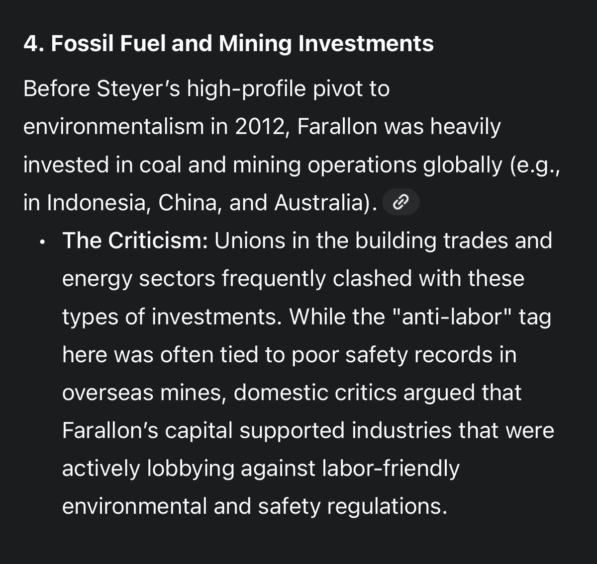 And before his conveniently-timed 2012 pivot to environmentalism, Farallon was heavily invested in coal and mining operations in Indonesia, China, and Australia—industries that were actively lobbying against labor-friendly environmental and safety regulations.