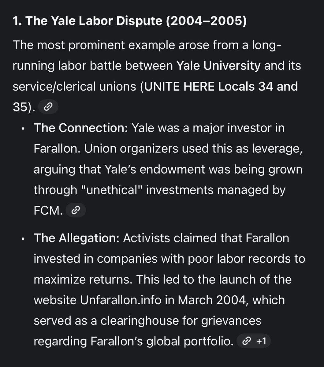 The opposition was so fierce that activists launched UnFarallon.info in March 2004 as a clearinghouse for grievances about Farallon’s global portfolio. Yale labor unions (UNITE HERE Locals 34 and 35) used Yale’s investments in Farallon as leverage during a brutal labor dispute in 2004-2005, arguing that the university’s endowment was being grown through unethical investments.