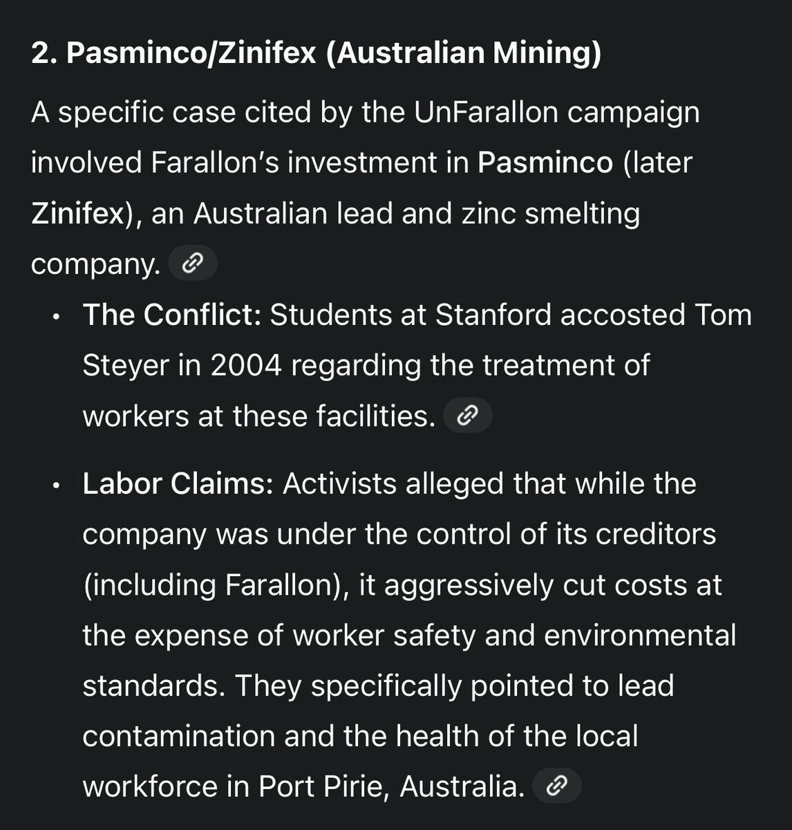 Stanford students confronted Steyer in 2004 about worker treatment at Pasminco/Zinifex mining facilities in Australia, where activists alleged the company aggressively cut costs at the expense of worker safety—specifically pointing to lead contamination and the health of the local workforce in Port Pirie.