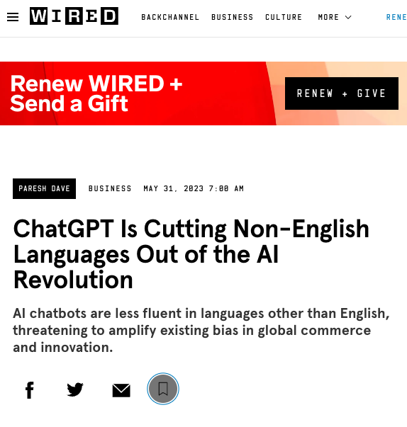 the state of technology journalism today: chatgpt is bad actually because it isn't equally competent in all languages yet. why does anybody pay attention to these people any more?