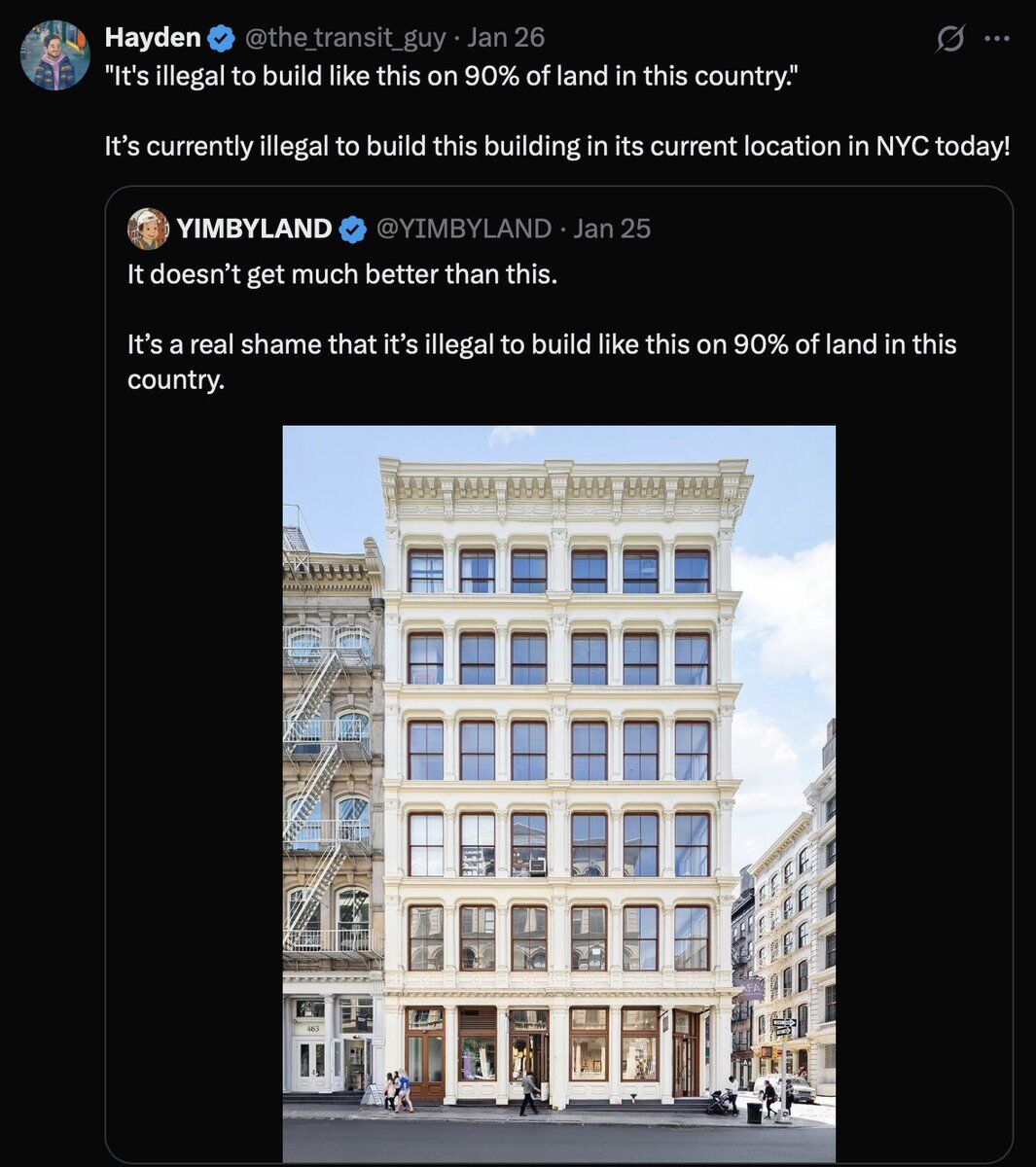 Archived tweetWe have vandalized the future of our cities by strangling development through zoning rules and building codes. Cities we love today, and the ways we live in them, would be illegal to rebuild as-is. 99% of voters don’t understand this.
